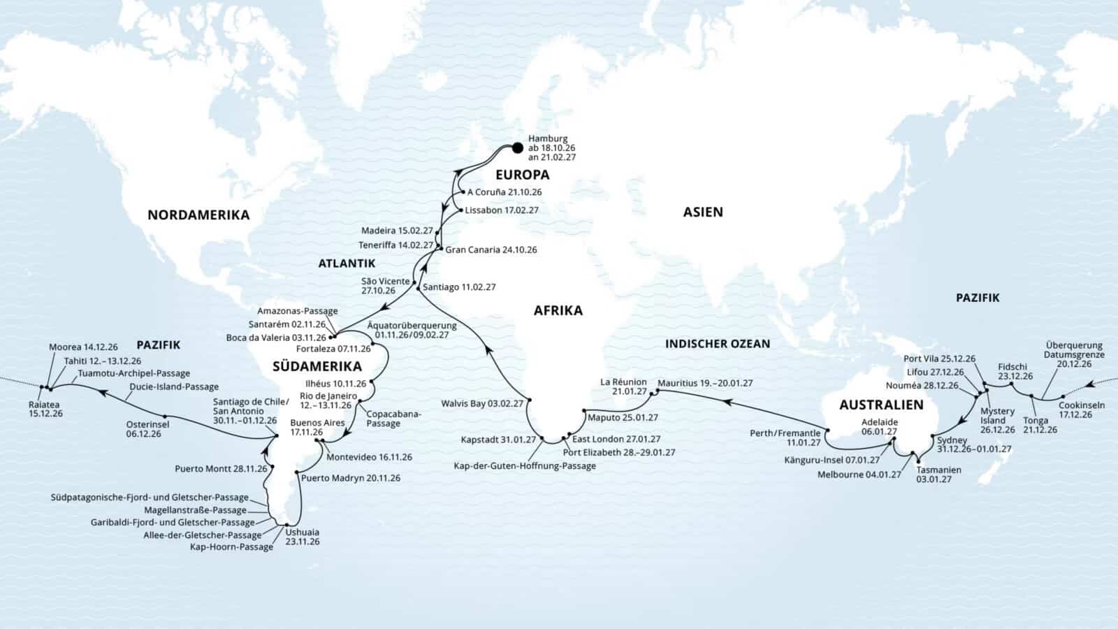 Dein Abenteuer startet entspannt: Die Segel gehen am 18. Oktober 2026 in Hamburg hoch. Du stößt mit einem Glas Sekt aufs Kommende an, während das Schiff Richtung Westen ablegt, vorbei an der Deutschen Küste und über die Nordsee. Danach umrundest Du Europa: vorbei an England, vorbei an Frankreich, weiter Richtung Süden zu den traumhaften Kanaren und Kapverden. Abends genießt Du perfekte Service-Qualität im Buffetrestaurant an Bord oder bei Live-Musik auf dem Pooldeck. Jede Hafenstadt ist wie ein Kapitel in Deinem Reisejournal – und Du bestimmst die Seite, die als nächstes aufgeschlagen wird.