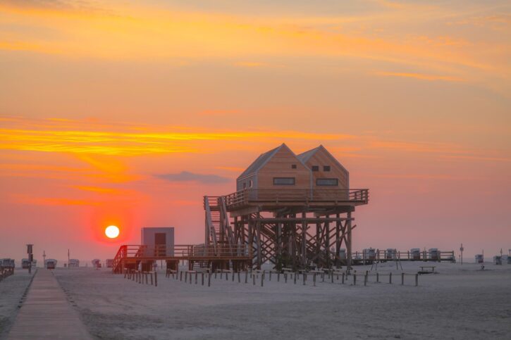 Der Tag beginnt früh, wenn die ersten Sonnenstrahlen den Horizont erhellen. Ein Spaziergang entlang des zwölf Kilometer langen Sandstrandes ist der ideale Start in den Tag. Die frische Meeresbrise und das sanfte Rauschen der Wellen schaffen eine beruhigende Atmosphäre. Während du barfuß durch den feinen Sand läufst, kannst du die berühmten Pfahlbauten bestaunen, die seit Jahrzehnten das Bild von St. Peter-Ording prägen. Diese auf Stelzen gebauten Häuser dienen als Restaurants, Cafés oder Rettungsstationen und sind ein beliebtes Fotomotiv.